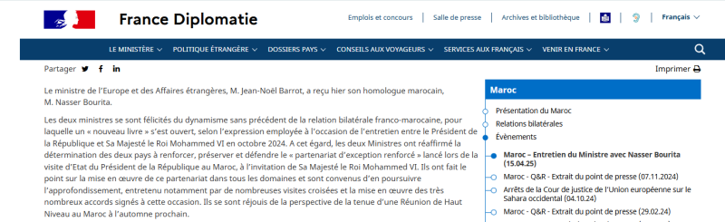 Nach einem Treffen zwischen dem französischen Minister für Europa und auswärtige Angelegenheiten, Jean-Noël Barrot, und seinem marokkanischen Amtskollegen, Nasser Bourita, am Dienstag, den 15. April, bekräftigte Frankreich nachdrücklich seine beständige Position in der Frage der marokkanischen Sahara.